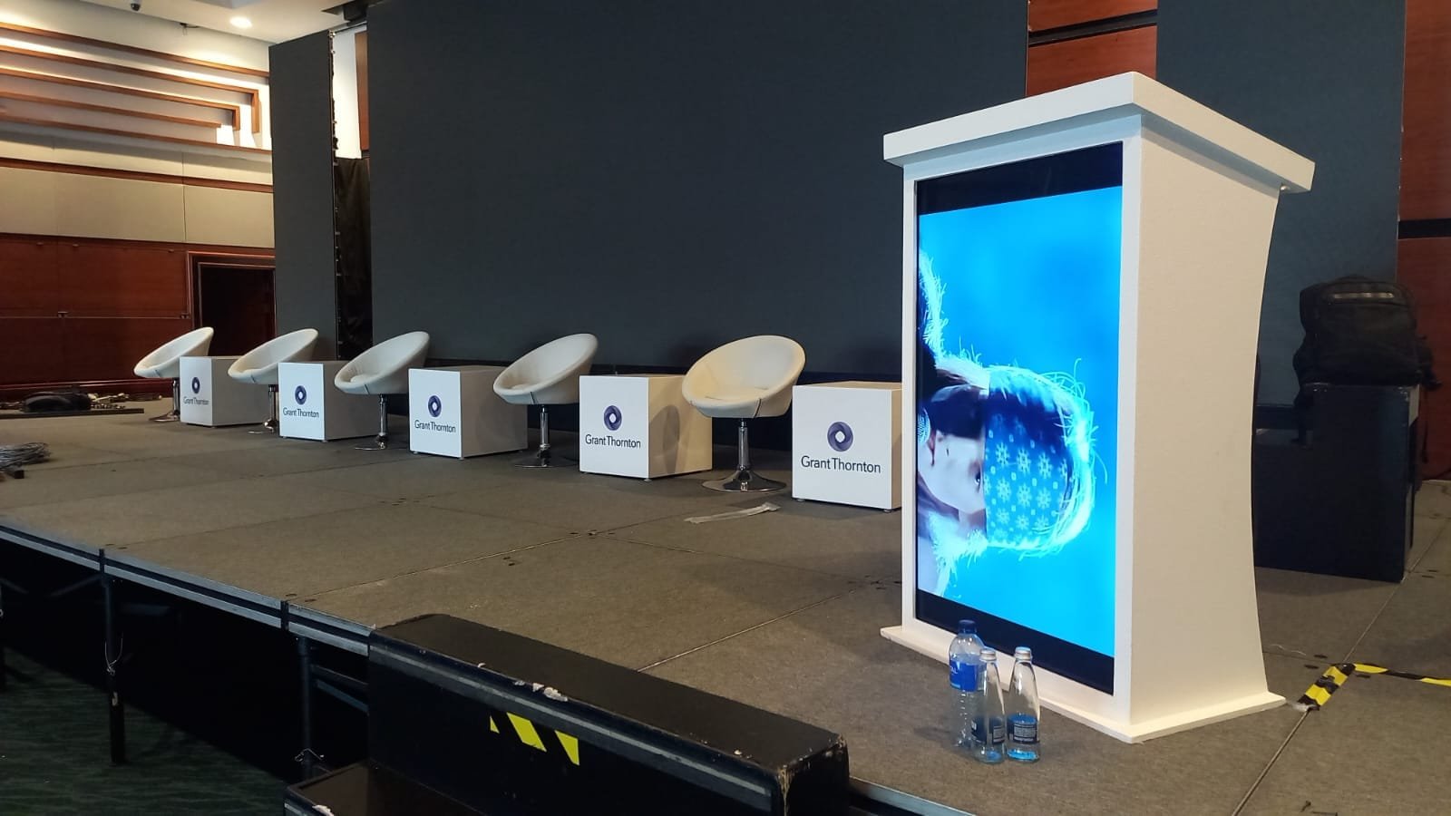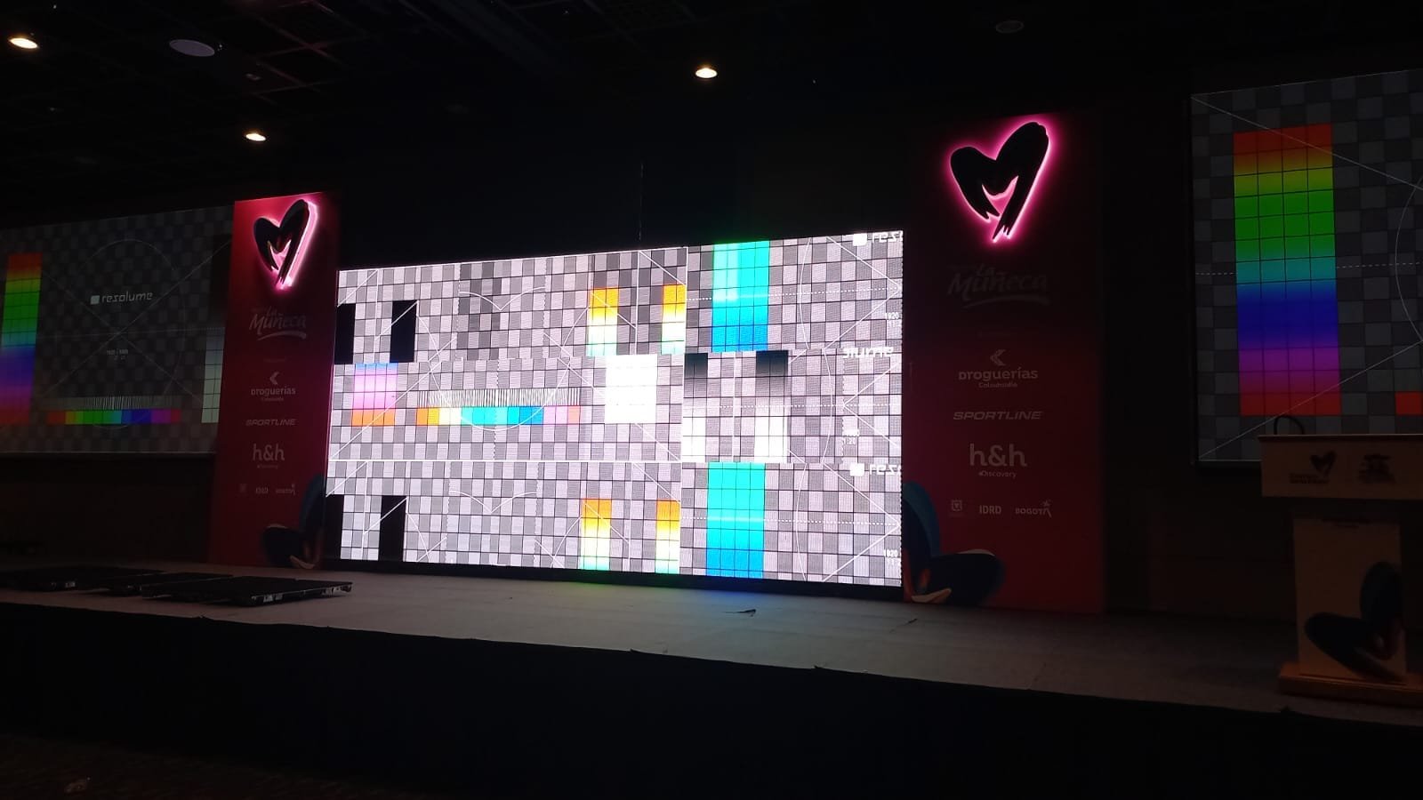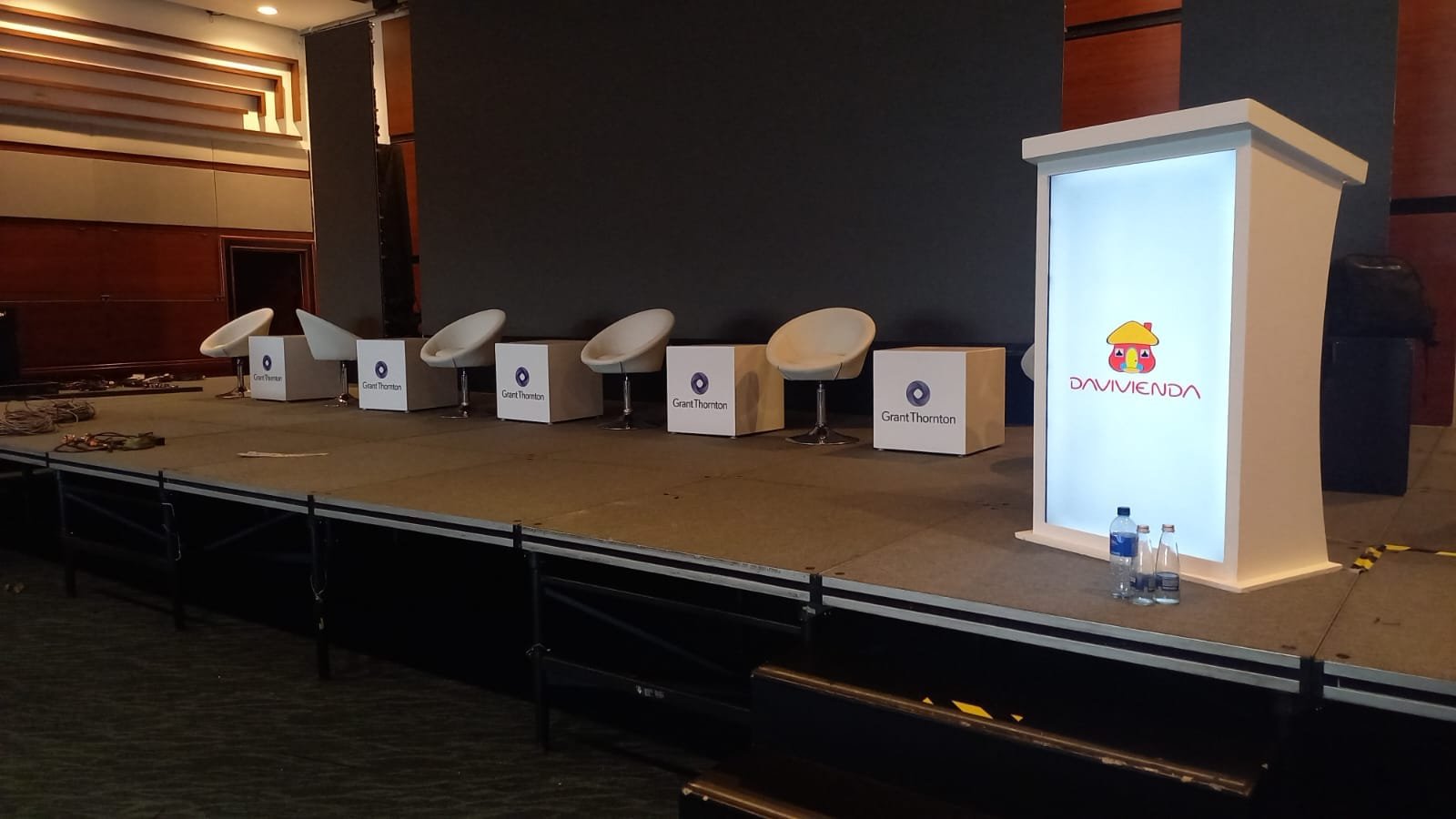 Configuración de counters, sillas y atril en tarima para eventos y convenciones, diseñada por BRA Publicidad.